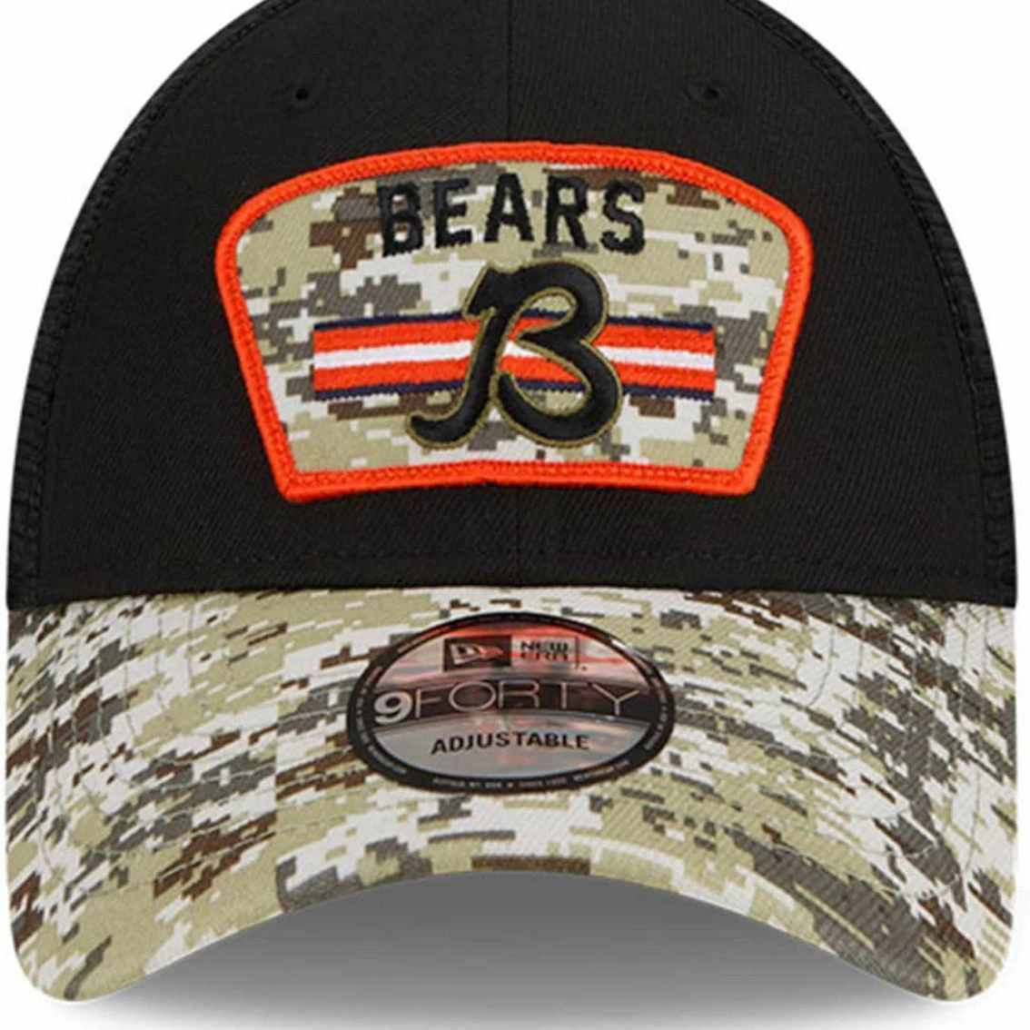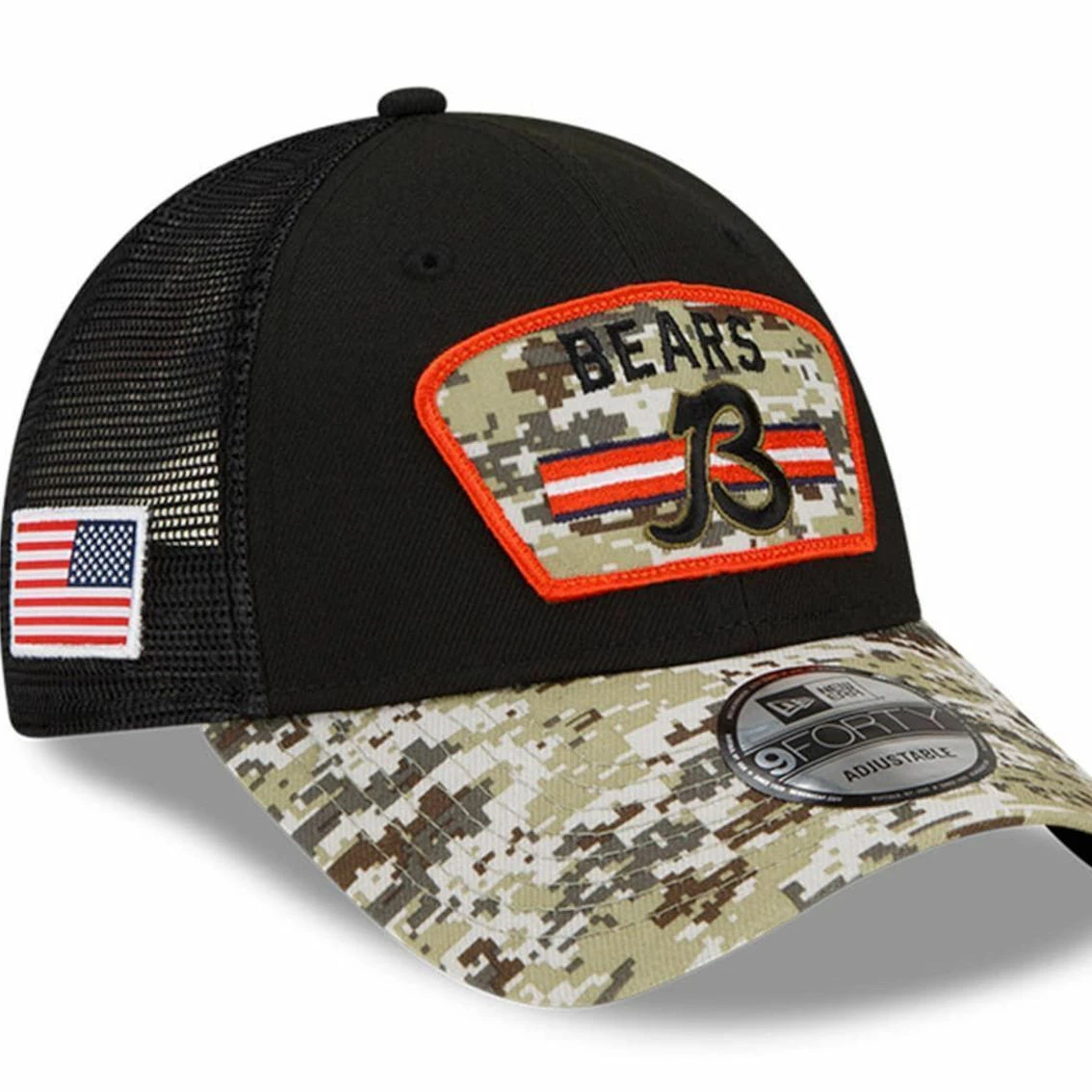 - Honor our service members while supporting the Chicago Bears in this year’s Official NFL Salute To Service Collection. This Trucker 9FORTY Snapback Adjustable Hat is constructed of black polyester on the front panels, mesh on the mid and rear panels and a camo patterned polyester fabric on the visor. The front crown features a fabric applique with custom Chicago Bears art. This patch uses the same camo fabric from the visor and is surrounded with contrasting team color embroidery. Finishing touches include an embroidered American flag patch on the right wear and the official NFL ”Salute to Service” patch on the rear. Join all the Chicago Bears players as they wear this cap on the field during the month of November. The NFL does not profit from the sale of Salute to Service products. Charitable contributions are awarded by the NFL Foundation to the NFL’s military nonprofit partners. For more information, please visit www.NFL.com/causes/salute.