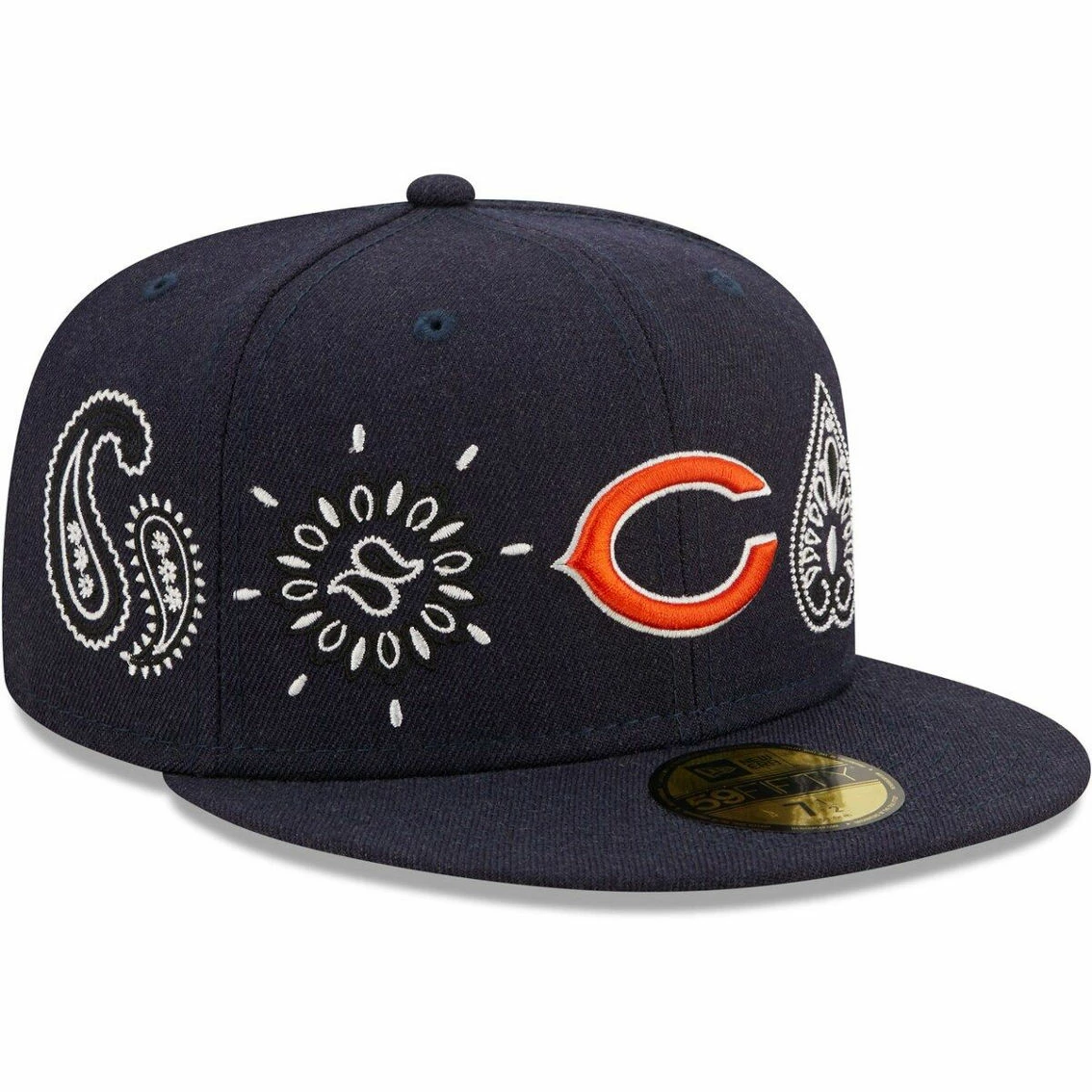 - Accentuate your favorite team’s logo with this Chicago Bears Bandana 59FIFTY hat from New Era. It features raised Chicago Bears graphics embroidered in the middle of bandana-inspired designs. The fitted construction also ensures this structured cap fits you perfectly.