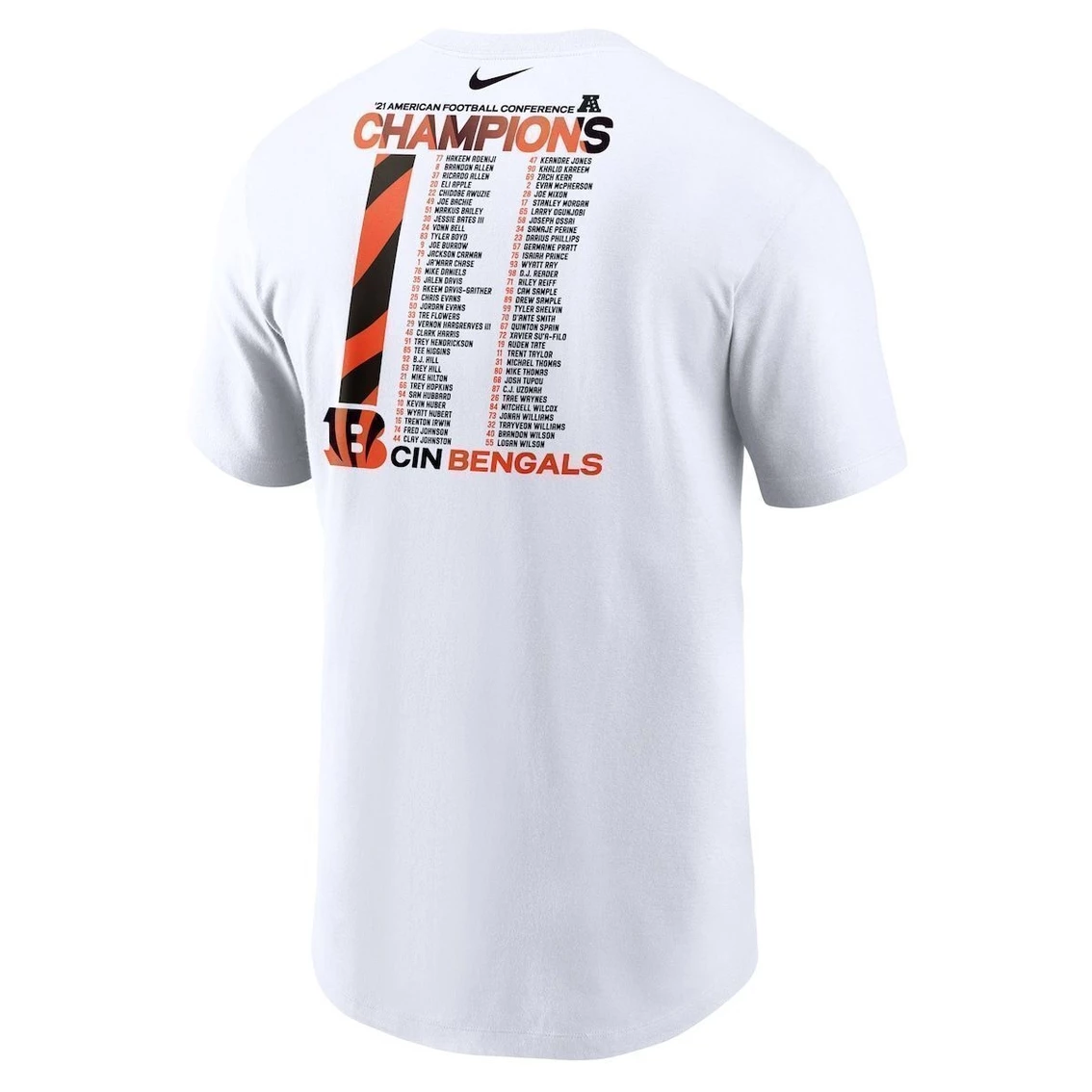 - The 2021 NFL season was nothing short of incredible, and it’s still not over! The Cincinnati Bengals are the 2021 AFC Champions and you couldn’t be more excited. Commemorate this sweet victory by grabbing this Roster T-Shirt from Nike. It features commemorative graphics that will show the Cincinnati Bengals your unwavering support in the Super Bowl.