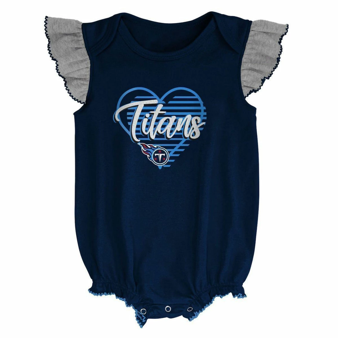 - Show everyone that the Tennessee Titans have all of your little one’s love with this three-piece set. It features adorable Tennessee Titans graphics on the bodysuit, bib and coordinating booties to further elevate their blossoming fandom. Plus, the ultra-soft fabric and snap closures ensure easy changing and total comfort.