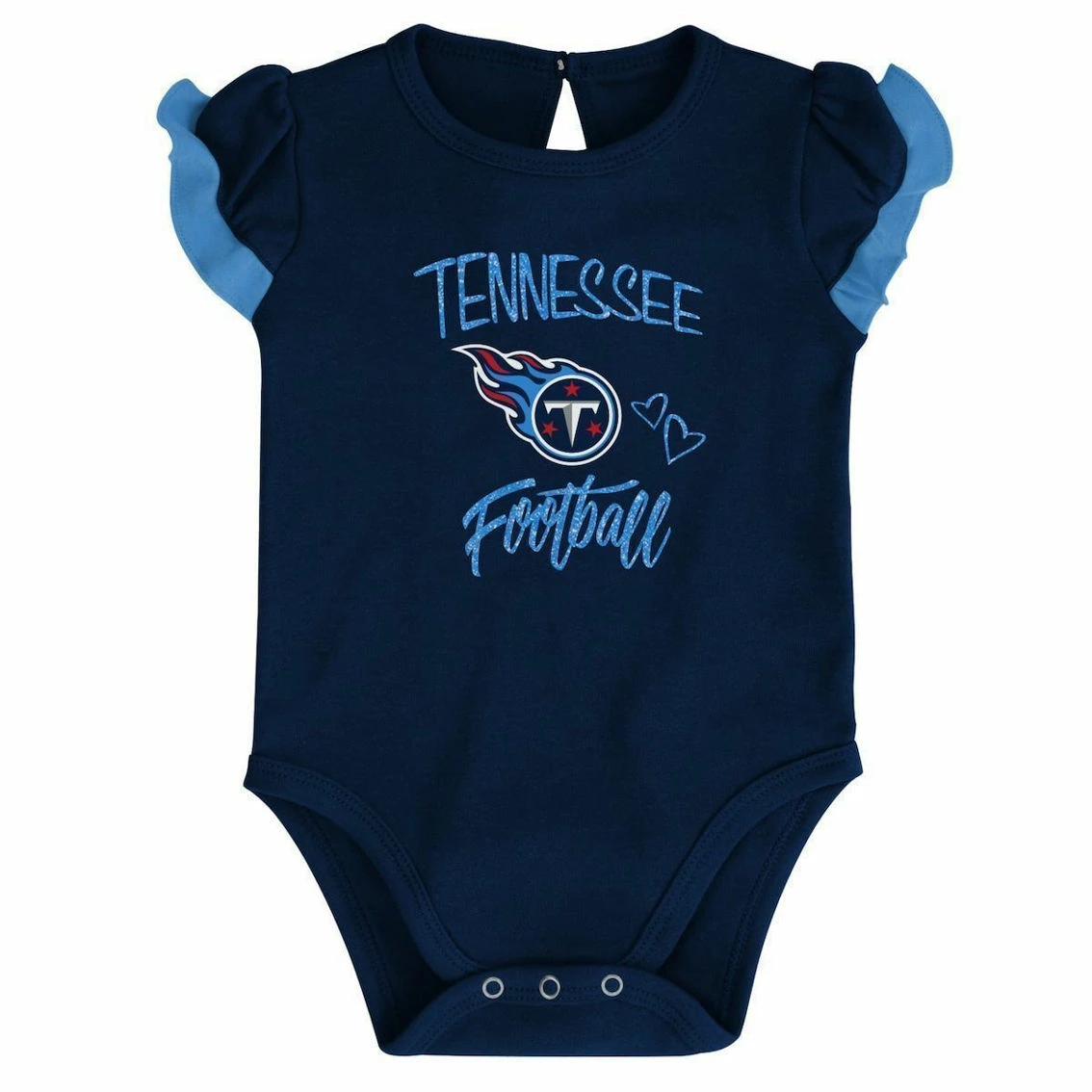 - Slip your little one into this Too Much Love set for an adorable dose of Tennessee Titans spirit. It includes two bodysuits decorated in charming Tennessee Titans colors and graphics with cute glitter details. Soft fabric and easy dressing features make this set super comfortable.
