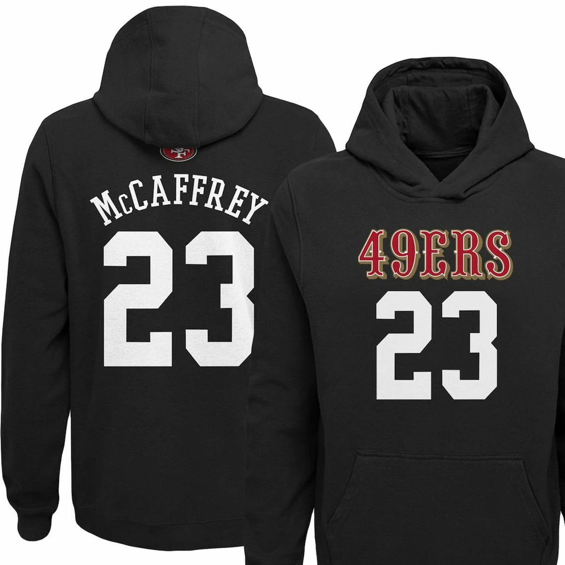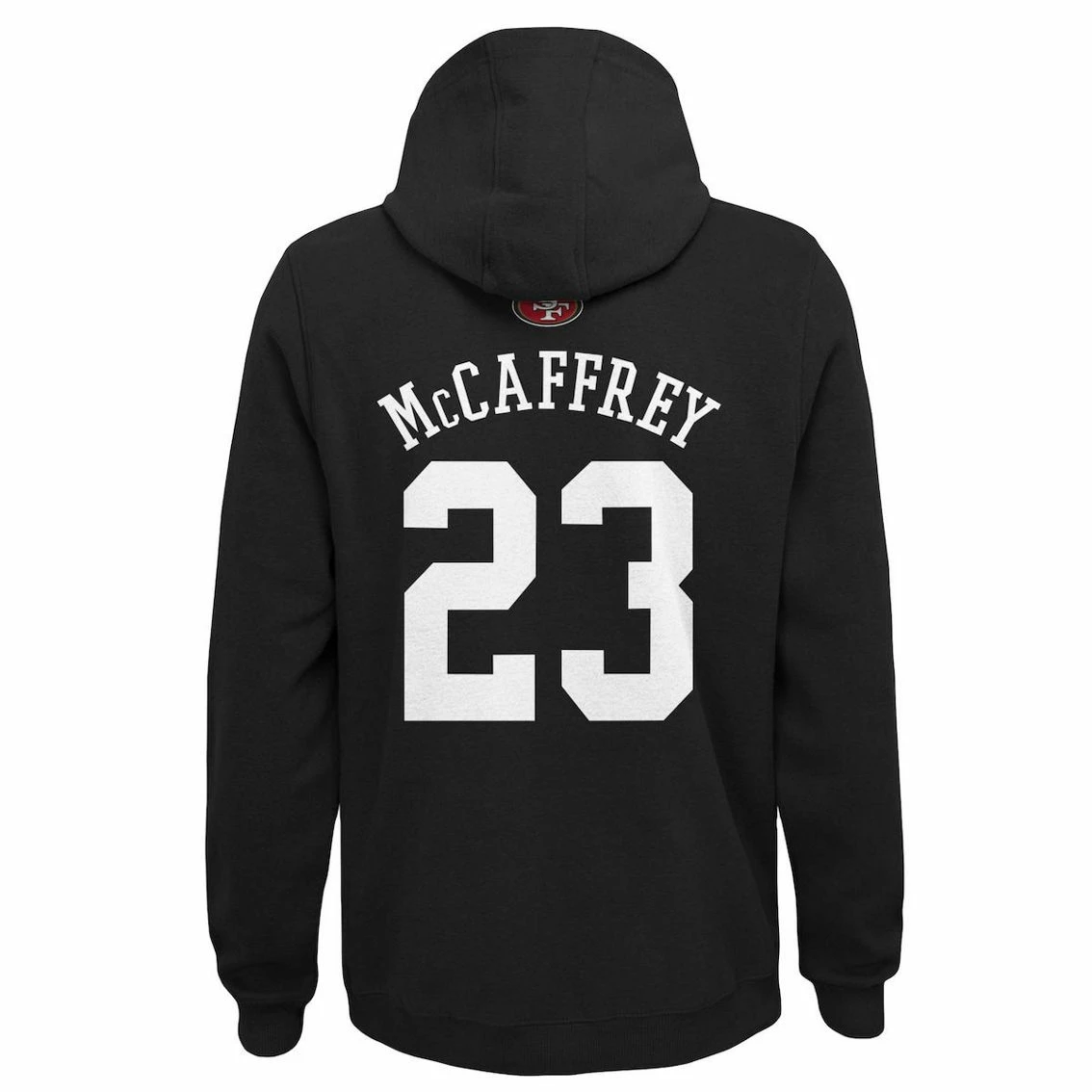 - Keep your kiddo warm and ready to cheer on the San Francisco 49ers with this Christian McCaffrey Mainliner Player Name and Number hoodie. Decked out in team colors, it not only features the franchise’s official wordmark across the chest, but it also has player-specific graphics on both sides. There’s no doubt this spirited pullover, which boasts super-soft material and a cozy hood, will help your youngster display their San Francisco 49ers pride.