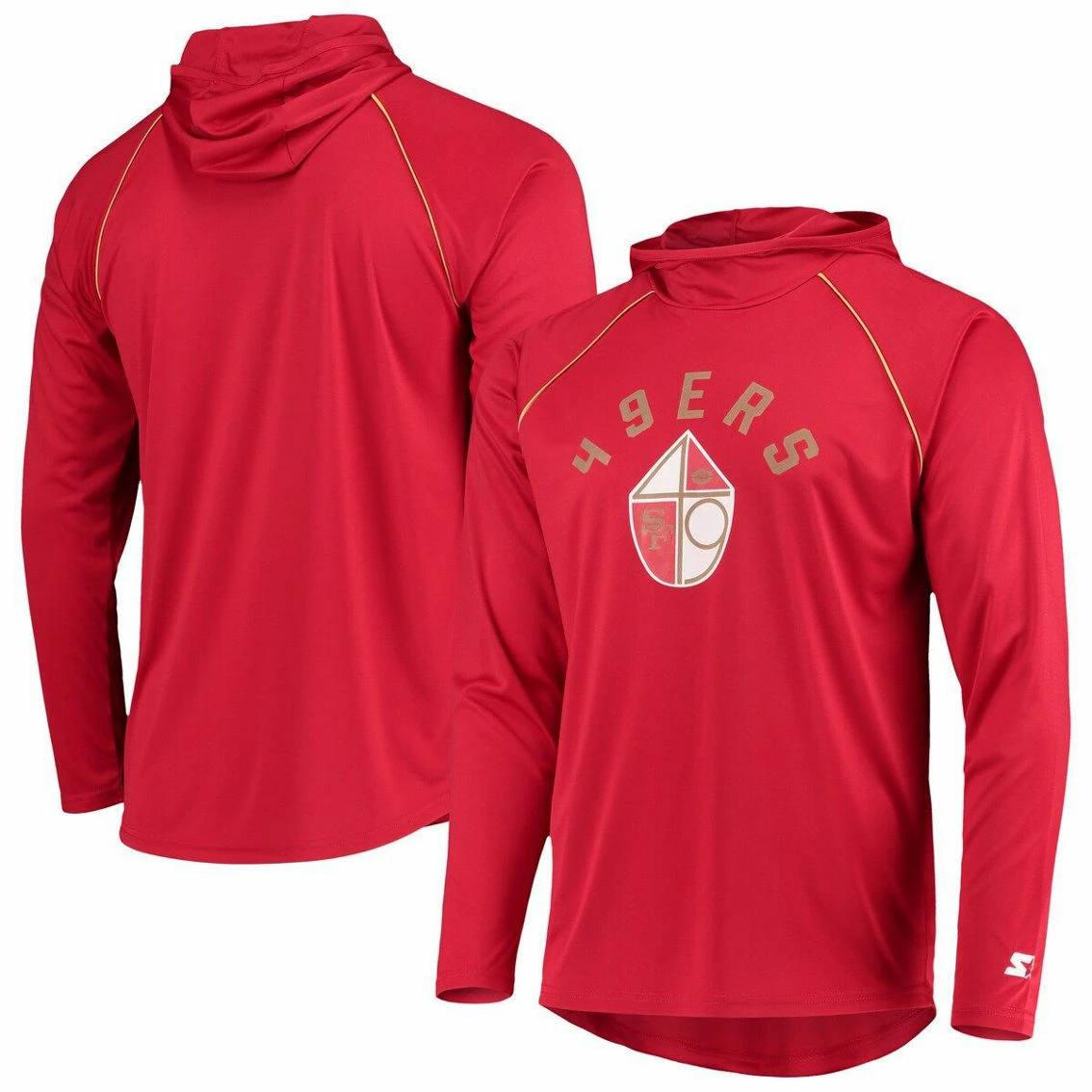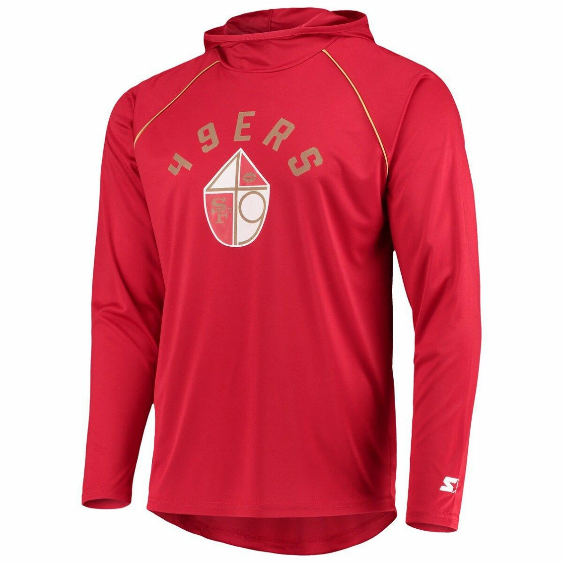 - Add the comfort of a hood to your San Francisco 49ers tee with this Throwback T-shirt from Starter. It features printed San Francisco 49ers graphics highlighted by contrast-color piping. Plus, raglan sleeves provide some extra room for more flexible movement.